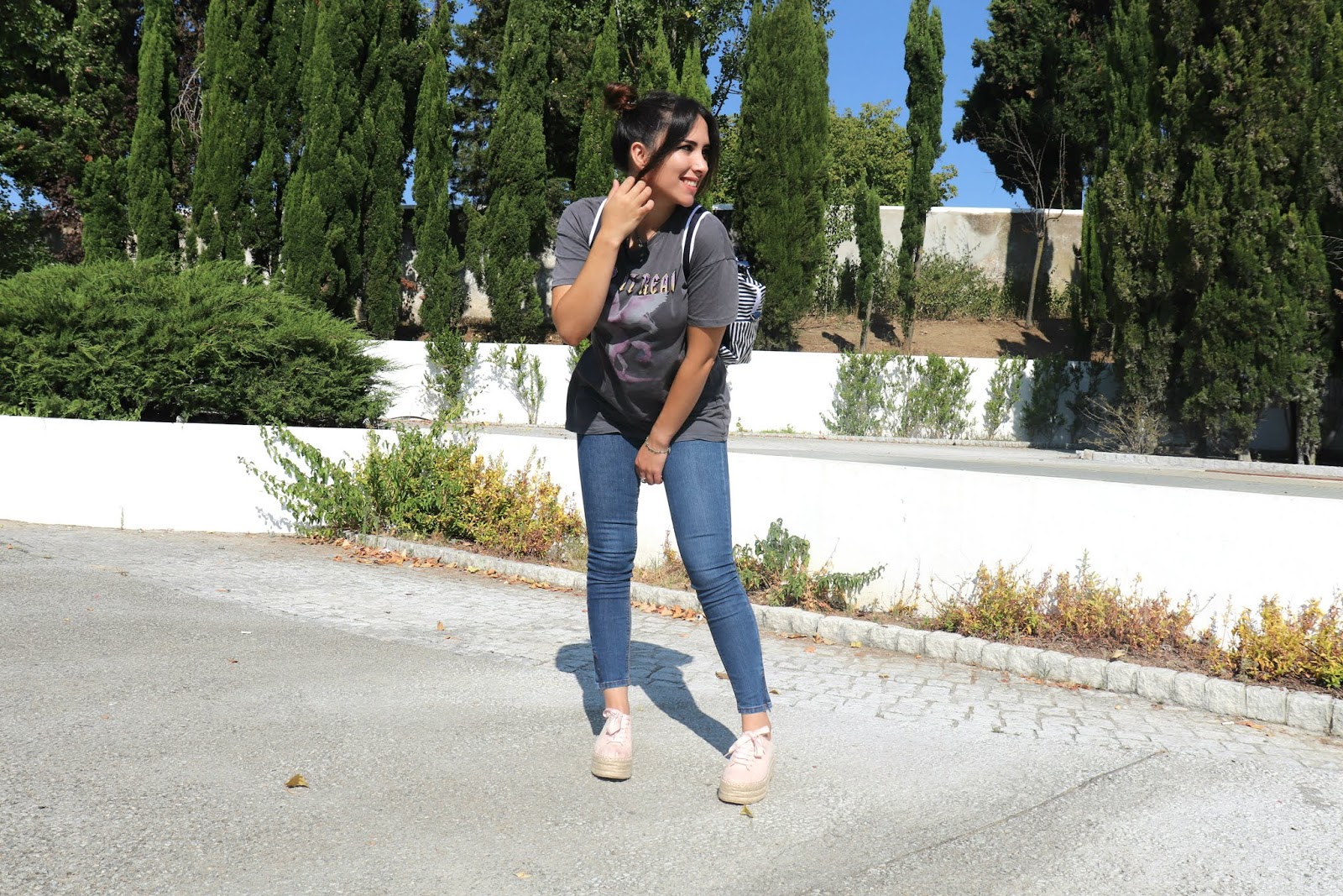 Peguei em algumas peças básicas que tinha por casa e construí o look de raiz, como faço sempre, sem qualquer tipo de inspiração prévia. A t-shirt já não é nova por aqui (Bershka), mas achei que passava muito bem a mensagem, à qual juntei as minhas skinny jeans (Pull & Bear). Calçei as minhas plataformas novas (Bershka) que foram prenda de aiversário dos pais do meu namorado (têm texto nos atacadores, são tão fofaas!) e por fim, mas não menos importante, adicionei a mochila da loja Trois Coutures que foi a minha grande inspiração para me atirar de cabeça neste outfit, pois passou-me bastante a ideia de uma mochila escolar coreana. Sabemos de antemão que no estilo coreano podemos encontrar muitos objetos, acessórios, roupas com um espirítio bastante playful e por outro lado, um bocado infantil, no bom sentido, diria no sentido da juventude. Por esse motivo, achei que tudo batia certo.